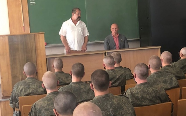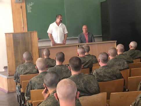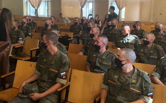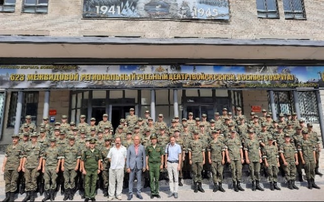 Начался день со встречи с офицерами Межвидового Регионального Учебного центра Войск Связи. Он осмотрел экспозицию на территории центра, посвященную Второй мировой войне и современным локальным конфликтам.