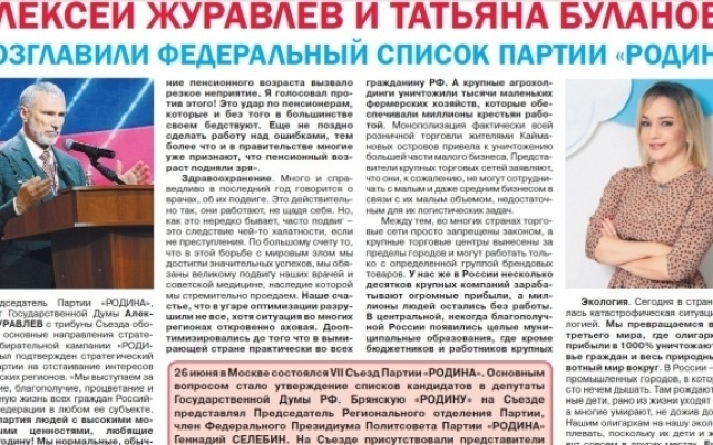 В июльском выпуске газеты "Голос РОДИНЫ. Брянск" (электронная версия газеты: "Голос РОДИНЫ. Брянск") опубликованы материалы о выдвижении партией "РОДИНА" кандидатов в депутаты Государственной Думы.