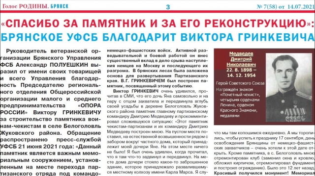 Руководитель ветеранской организации Брянского Управления ФСБ Александр ПОЛУЕШКИН выразил от имени своих товарищей и всего Управления благодарность Председателю регионального отделения Общероссийской организации малого и среднего предпринимательства «ОПОРА РОССИИ» Виктору ГРИНКЕВИЧУ за строительство памятника воинам-чекистам в селе Белоголовль Жуковского района. Обращение распространено пресс-службой УФСБ 21 июня 2021 года: «Данный памятник является важным мемориальным сооружением, установленным на месте перехода партизанского отряда под командованием Героя Советского Союза Д.Н. Медведева за линию фронта в годы Великой Отечественной войны. Указанное событие приобретает особое значение в год 80-летия основания партизанского движения на Брянщине. От лица ветеранов органов безопасности выражаем благодарность В.Г. ГРИНКЕВИЧУ за помощь в создании памятника и обеспечение его реконструкции».