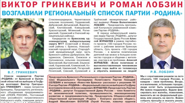 Председатель Брянского Регионального отделения Партии "РОДИНА", член Федерального Президиума Политсовета Партии Г.Г. СЕЛЕБИН в интервью "Новостям Брянска" рассказал о решениях VII Съезда Партии «РОДИНА»: «Федеральный список на выборах в ГосДуму возглавили Алексей Александрович ЖУРАВЛЕВ (Председатель Партии "РОДИНА", депутат Государственной Думы России - член Комитета по экономической политике, промышленности, инновационному развитию и предпринимательству, Председатель Общероссийской общественной организации "Родина - Конгресс русских общин"), Андрей Михайлович БОГАТОВ (Герой России, кавалер орденов Мужества и Красной Звезды, участник войн в Афганистане, Югославии, Сирии, командир 4-й разведывательно-штурмовой роты ЧВК "Вагнер"), Татьяна Ивановна БУЛАНОВА (эстрадная певица; Заслуженная артистка РФ, двукратная обладательница премии "Овация", трёхкратная - премии "Питер FM", семикратная - премии "Золотой граммофон" и премии "Шансон года", девятикратная - премии "Звезда Дорожного радио"), Михаил Леонидович ХАЗИН (экономист, писатель, Постоянный член Изборского клуба, экс-заместитель начальника экономического управления Администрации Президента РФ). Список кандидатов Партии "РОДИНА" от Брянской и Орловской областей возглавил Виктор Григорьевич ГРИНКЕВИЧ - лидер патриотов Брянщины, Председатель регионального объединения предпринимателей "ОПОРА РОССИИ", Постоянный член российского патриотического Изборского клуба, помощник депутата ГосДумы России А.А. ЖУРАВЛЕВА - Председателя Партии "РОДИНА". Виктор Григорьевич ГРИНКЕВИЧ также выдвинут кандидатом в депутаты Государственной Думы России по Унечскому одномандатному избирательному округу №78. Кандидатом по Брянскому одномандатному избирательному округу №77 выдвинут Роман Валентинович ЛОБЗИН - Председатель Центральной КРК Партии "РОДИНА". 27 июля федеральный список кандидатов Партии «РОДИНА» зарегистрирован ЦИК России, 30 июля кандидатами в депутаты Государственной Думы по одномандатным избирательным округам Избирательной комиссией Брянской области зарегистрированы Виктор ГРИНКЕВИЧ и Роман ЛОБЗИН.