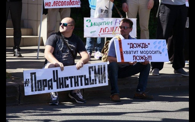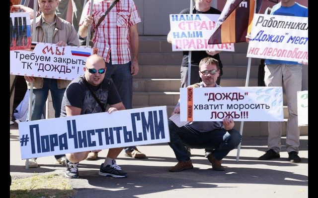 Лозунгами пикета были: "ТК Дождь – предатель Родины"; "Дождь" – хватит моросить ложь"; "Мы требуем закрыть ТК "Дождь"; "Пятая колонна в СМИ"; "Телеканал "Дождь" – лживый рупор Госдепа; "Наша страна – наши правила"; "Пора чистить СМИ"; "Работникам "Дождя" - место на лесоповале"; "Защитим Россию от "Дождей"; "ТК "Дождь" – разврат моральных ценностей"; "За зачистку пятой колонны"; "Дождь" и РБК – лживые агенты Запада" и другие.