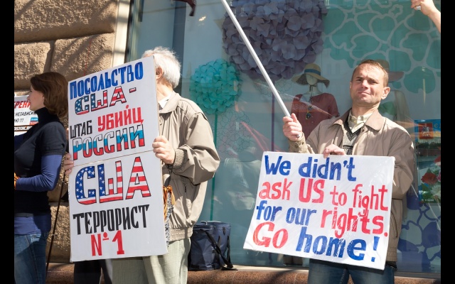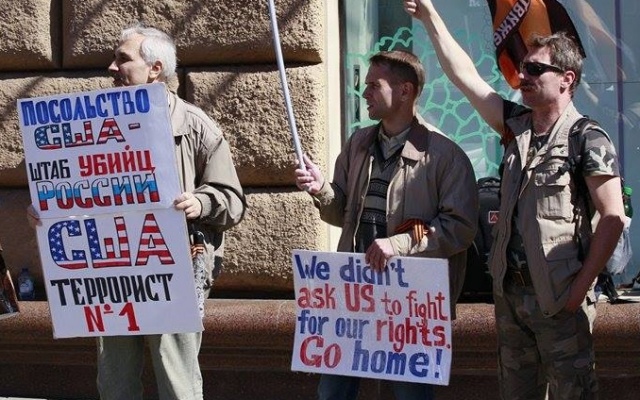 Участники массового пикета протестовали против вмешательства США в дела суверенных стран, геноцида русских на Украине, бомбардировок Сирии, поддержки ИГИЛ.