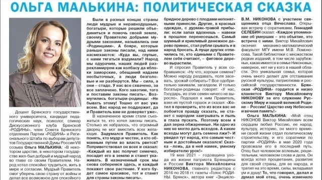 Ольга Малькина: "Мой отец Никонов Виктор Михайлович всем сердцем любил Россию, ее народ, культуру, историю, он много времени своей жизни отдал политическому строительству, и его соратники по партии "РОДИНА" в мае 2020 года провожали его в последний путь. Отец был человеком волевым, решительным, человеком слова и дела. Он всегда хотел процветания, развития для своей страны, для ее народа, и тратил на это время, силы, вкладывал ум и душу! То, что говорил, делал и думал мой отец, очень изменило меня: и попала я в Партию "РОДИНА" как раз-таки потому, что отец считал, что есть такая замечательная партия, и что замечательные люди занимаются таким достойным делом. Я пришла и осталась в партии "РОДИНА". Наверное, поэтому я никогда не смогу разлюбить свою страну, чтобы о ней не говорили, какой бы грязью не поливали, как бы сложно не жилось, нет лучше нашей земли для меня!"