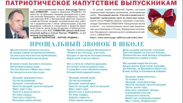 В школах нашей необъятной Родины состоялся традиционный праздник школьников, заканчивающих учебу - Последний звонок. Учителя и родители отправляют выпускников школ во взрослую жизнь. Газета "Голос РОДИНЫ. Брянск" публикует стихи Александра Сергеевича Субботина "Прощальный звонок в школе" - патриотическое напутствие выпускникам школ Брянщины и России. Видеоролики исполнения "Прощального звонка в школе" размещены на сайте Александра Субботина.