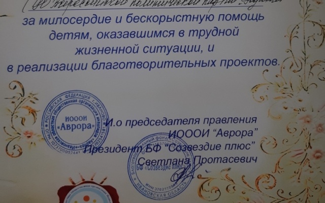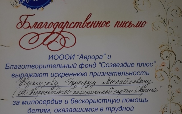Председатель Совета регионального отделения партии "РОДИНА" в Ивановской области Эдуард Кутузов получил благодарность от Ивановской областной общественной организации инвалидов "Аврора" и Благотворительного фонда "Созвездие плюс".
