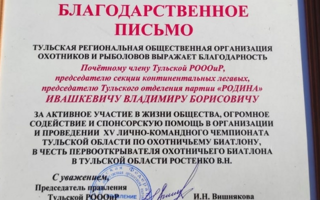 Владимир Ивашкевич поблагодарил участников и организаторов Чемпионата и отметил, что вполне символично, что данного рода мероприятие проводится в день празднования Дня Защитника Отечества. Ведь более чем за столетнюю историю существования Общества, тысячи охотников получили первичные навыки владения оружием и меткой стрельбы, опыт дальних переходов и скрадывания, которые пригодились в разные годы при защите своего Отечества.