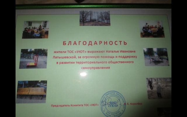 На этом празднике Латышевской было вручено благодарственное письмо "За огромную помощь и поддержку в развитии территориального самоуправления". В концертной программе приняли участие ансамбль "Бабье лето", казачий дуэт, а дети читали стихи и играли на музыкальных инструментах.