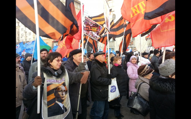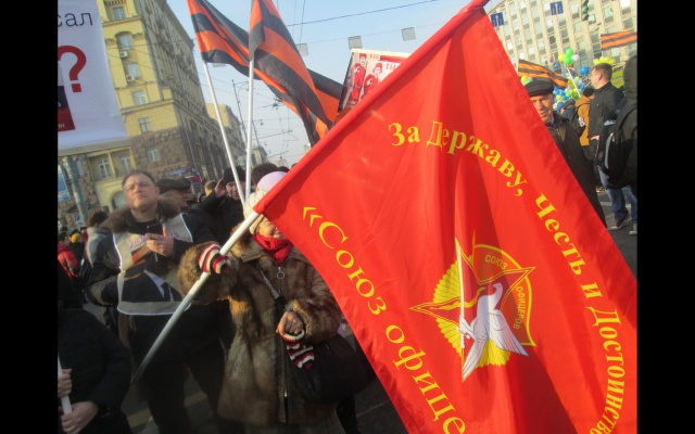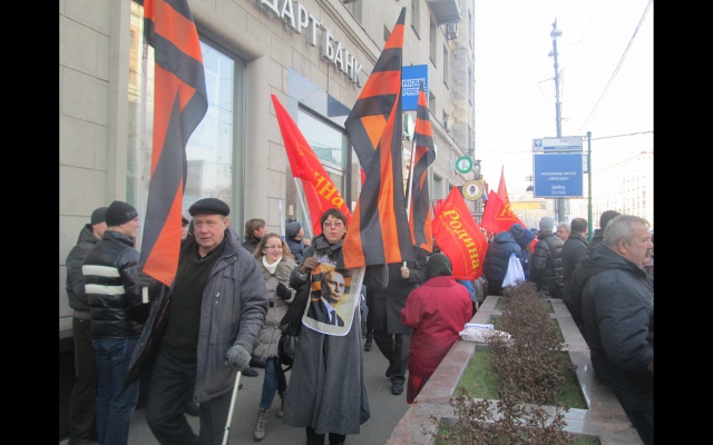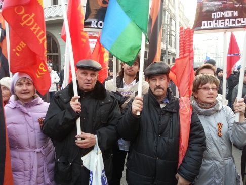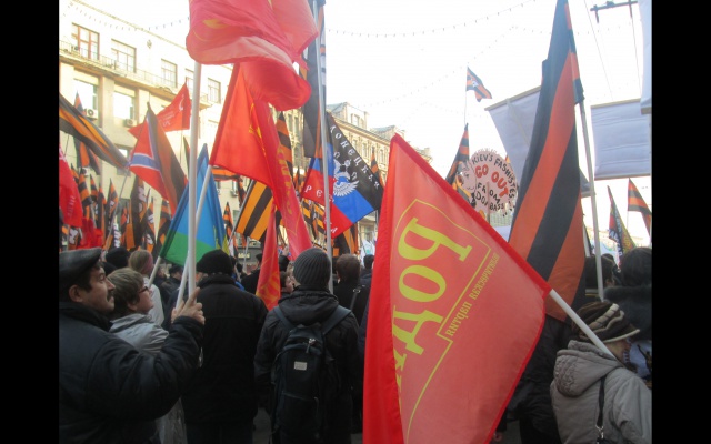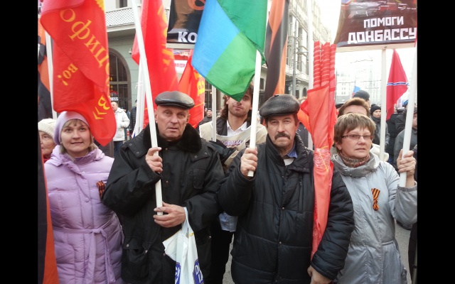 Многие участники принесли с собой флаги Новороссии и лозунги: "Будь патриотом, поддержи Донбасс", "Россия вставай за Новороссию".