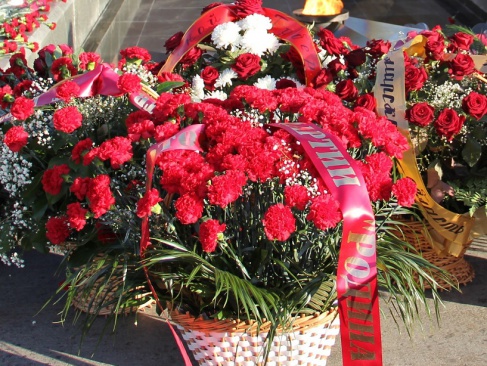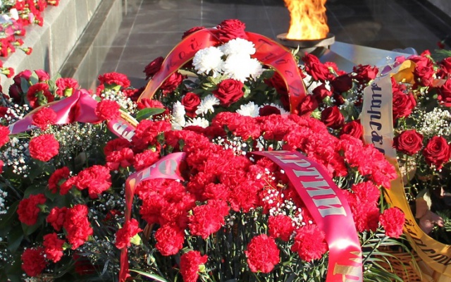 После минуты памяти павших героев и исполнения Государственного гимна Российской Федерации началась торжественная церемония возложения цветов к Вечному огню у горельефа Скорбящей Матери-Родине.