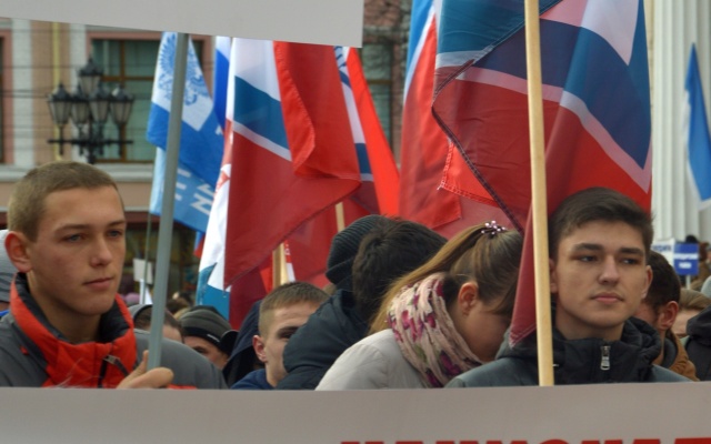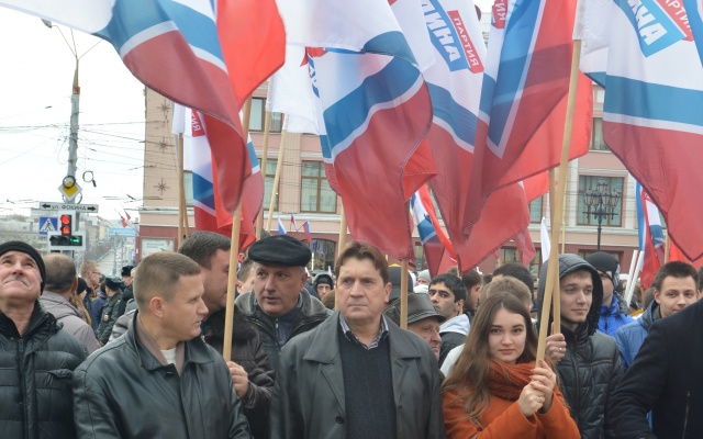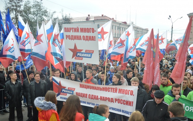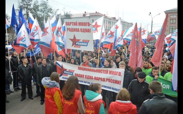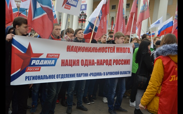 Брянские родинцы, захватывающие все больше политического пространства, заняли место у трибун и оказались во главе участников митинга. Лозунги партии в День народного единства: "Национальностей много, а нация одна - народ России!", "Партий много - Родина одна!"