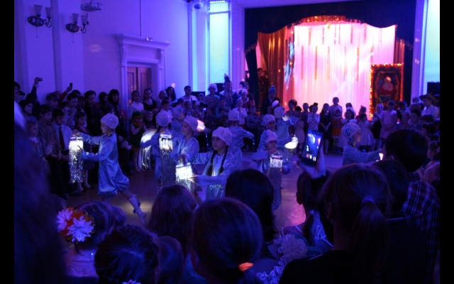Перед началом театрализованного представления у большой нарядной елки в фойе ДК выступили самодеятельные артисты с разнообразной музыкальной и танцевальной программой. Творческие коллективы Дворца культуры подготовили для ребят новогоднюю дискотеку и игротеку, веселые хороводы с участием Деда Мороза и Снегурочки, сказочных персонажей, героев мультфильмов.