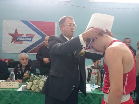 Заместитель председателя регионального отделения Александр Катушев вручил победителям в номинации "За лучший бой" памятные подарки: боксерские перчатки и сертификаты в спортивный магазин.