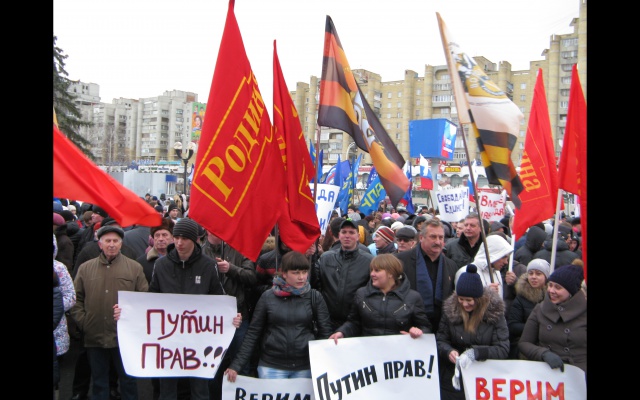 Родинцы подготовили лозунги-плакаты: "Крым – мы с тобой!", "Своих не бросаем", "Мы вместе!", "Крым — русская земля", "Чужого не надо, своего не отдадим", "Верим Путину!", "Путин прав!" , «Севастополь – город русских моряков!» и  другие.