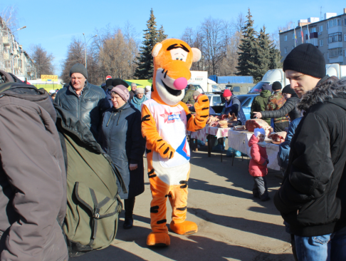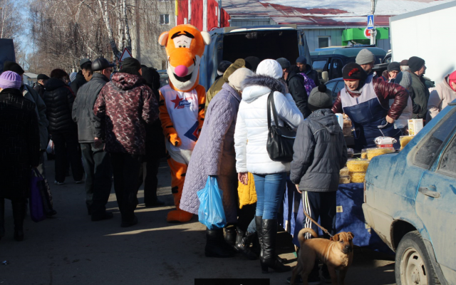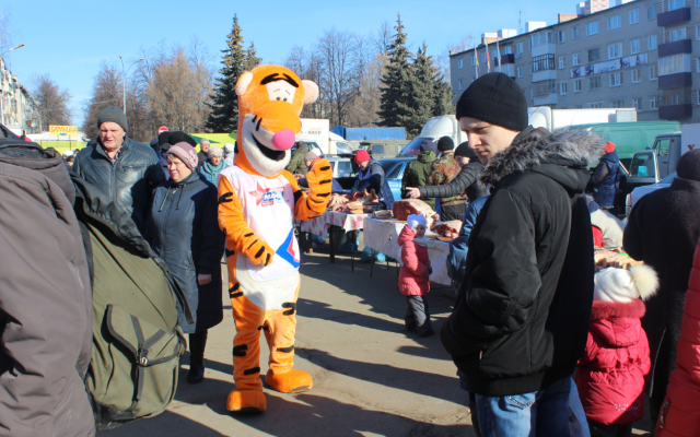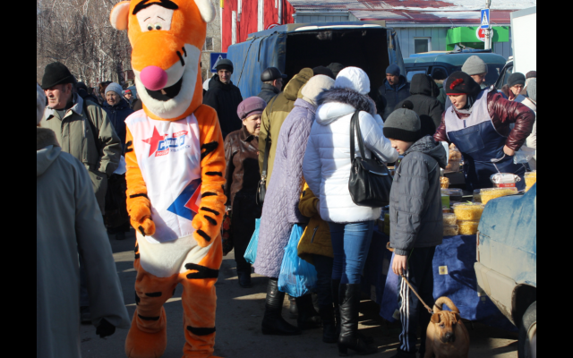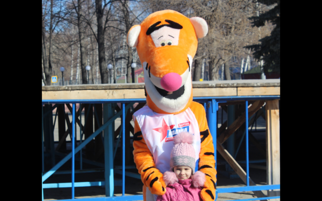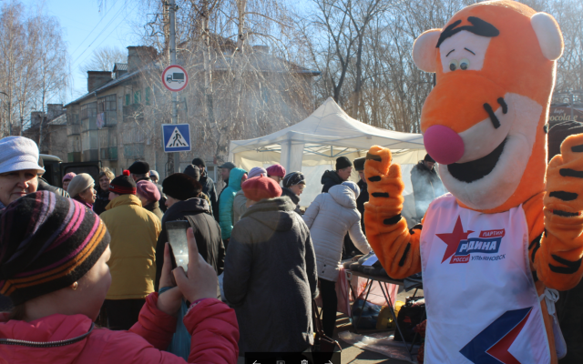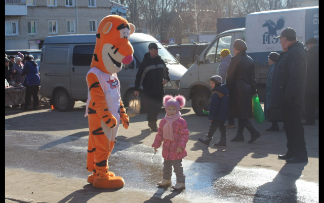 В Новоульяновске на площади Ленина, где в начале марта проходила ярмарка под брендом "Фестиваля рыбы", ростовая кукла развлекала покупателей и предпринимателей, реализующих свою продукцию. Дети и родители охотно фотографировались с плюшевым тигром, играли и шутили.