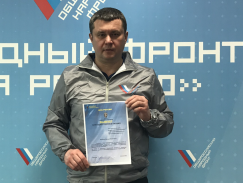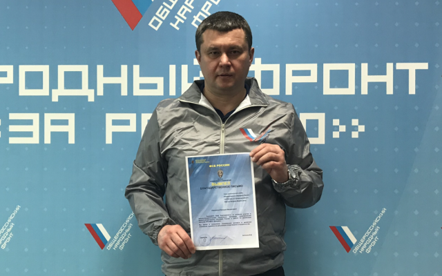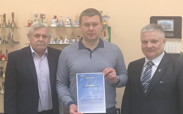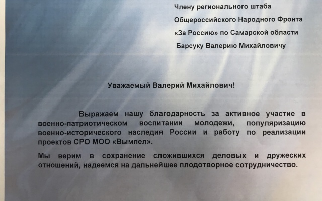 Владимир Антонов наградил благодарственным письмом Валерия Барсука, подчеркнув, что Международная общественная организация "Вымпел" высоко ценит патриотическую работу города с молодежью.